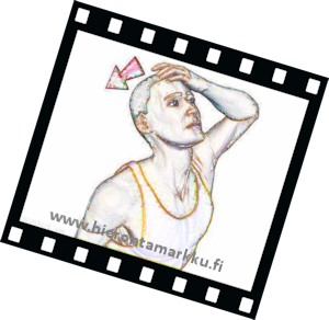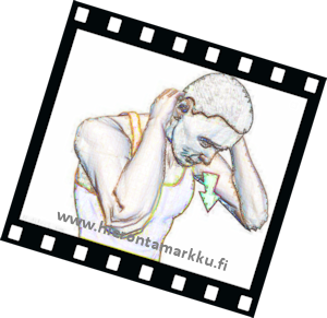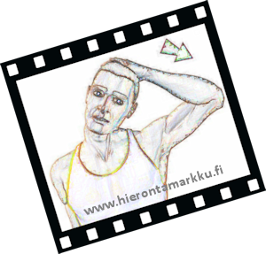 Voit tehdä venytyksen seisten tai istuen. Ota toisella kädellä päästäsi kiinni kuvan osoittamalla tavalla. Tee venytys kädellä avustaen. Voit tehostaa venytystä laskemalla vapaata kättäsi varpaita kohden. Nuoli näyttää venytyksen suunnan. Pidä venytys 10 sekunnin ajan. Toista tarpeellinen määrä (esim. kolme kertaa) ja tee venytys toiselle puolelle. |