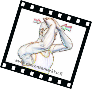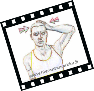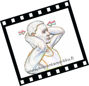 Voit tehdä venytyksen joko seisten tai istuen. Paina kädelläsi samalla, kun pakotat päätäsi vastakkaiseen suuntaan. Säilytä pääsi asento suorana. Nuolet näyttävät venytyksen suunnan. Pidä venytys 10 sekunnin ajan. Toista tarpeelllinen määrä ja vaihda puolta. |